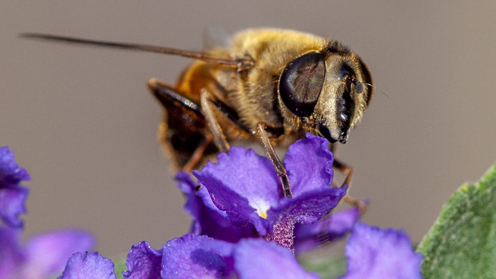 Hoewel de blinde bij sprekend op een honingbij lijkt, behoort hij tot de zweefvliegen. Hij heeft geen angel en kan dus niet steken. Mogelijk wordt hij daarom ‘blind’ genoemd – alsof hij zich niet zou kunnen verdedigen. Maar dat klopt niet: deze zweefvlieg ziet uitstekend. De gelijkenis met een honingbij is een voorbeeld van mimicry; een natuurlijk overlevingsmechanisme waarbij een ongevaarlijk dier eruitziet als een gevaarlijke soort om vijanden af te schrikken. Zelfs het zoemende geluid en de vliegstijl van de blinde bij dragen bij aan deze misleiding. Toch zijn er duidelijke verschillen met een echte bij. De vlucht van de blinde bij is typisch voor een zweefvlieg: hij beweegt snel van plek naar plek en hangt vaak stil in de lucht. Een honingbij vliegt daarentegen veel vloeiender. Daarnaast heeft de blinde bij de karakteristieke grote ogen en de kop van een vlieg, waarmee je hem gemakkelijk kunt herkennen. En waar een honingbij twee paar vleugels heeft, heeft de blinde bij er slechts één paar – al is dat verschil met het blote oog moeilijk te zien.